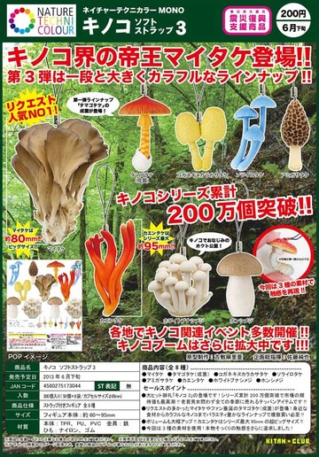 2013年7月21日 投稿者: sonokinoko キノコソフトストラップ3! あぁ!二つ目にして一番欲しかったソライロタケが出てきました!うっ嬉しすぎる! 一つ目はタマゴタケ、ひだもきれいでしょう?シマシマも! でもアミガサダケが出るまではやります!
